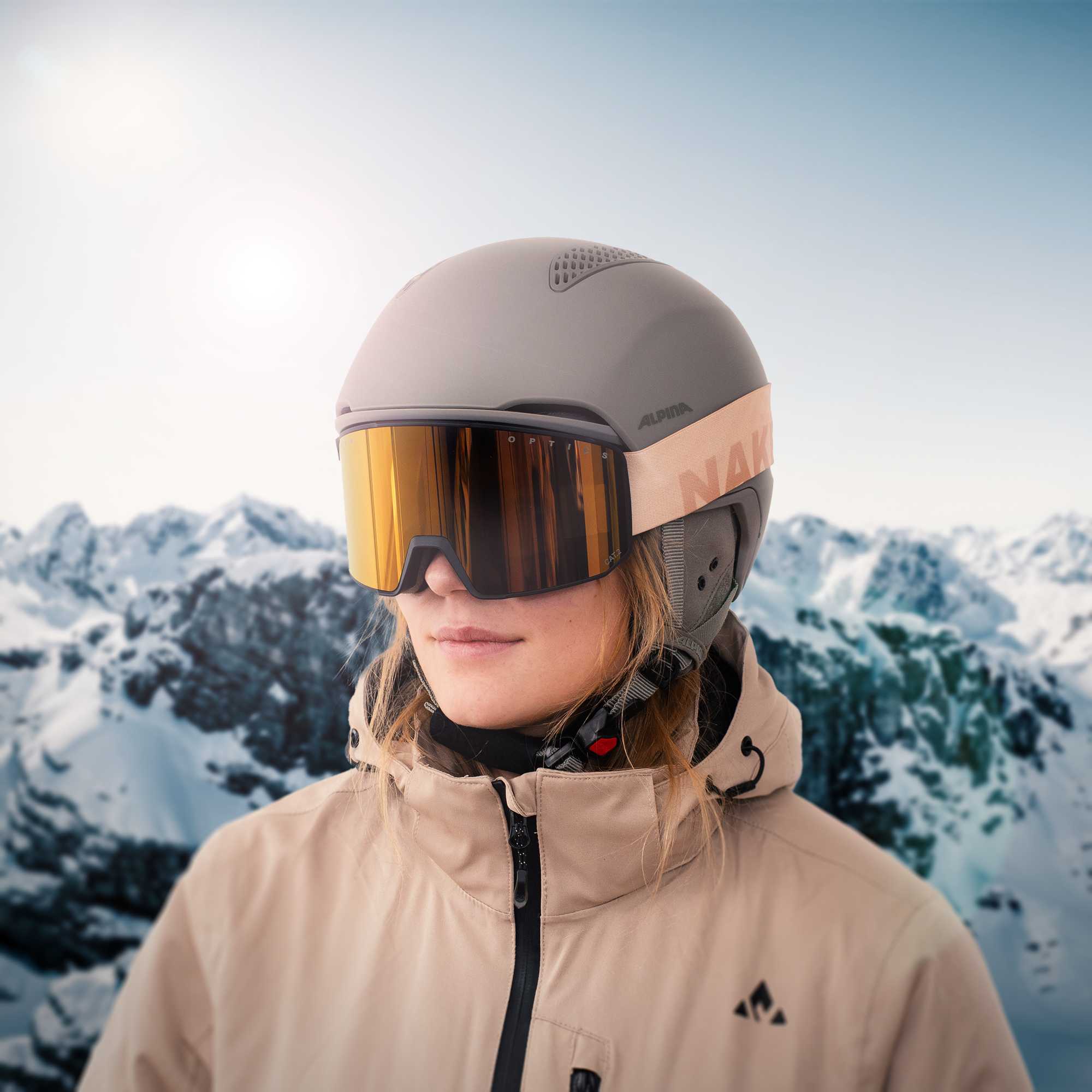 Eine Frau trägt eine Skibrille und führt das magntische Wechselglassystem der Brille vor; Credits: Kathy Lerchner