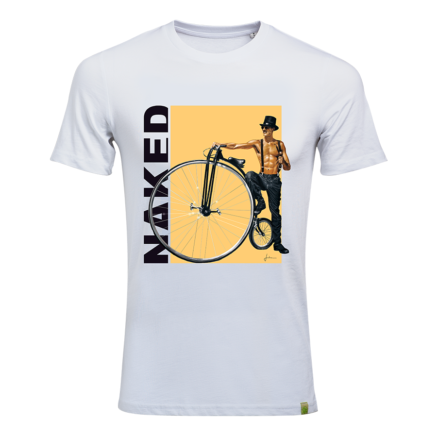The fair wear motifs were created in cooperation with a local artist from Austria. We always come up with something very special for our NAKED family. Round off your style perfectly with the NAKED Optics High-Wheeler T-Shirt with the biek legend Stevie Schneider . The unique motif with Stevie Schneider was drawn by hand after the photo shoot and then printed and produced on the T-shirt in the sheltered workshop in Salzburg (GWS). Every purchase of a Stevie Schneider t-shirt secures a job from disabled people.